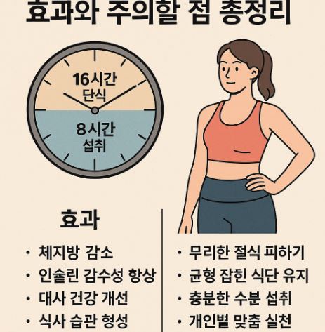 간헐적 단식 16:8은 단순한 식이조절을 넘어 대사 개선과 건강 전반에 긍정적인 영향을 미친다고 알려져 있다. 첫 번째 장점은 **체지방 감소**다. 공복 시간이 길어질수록 인슐린 수치가 낮아지고, 우리 몸은 저장된 지방을 에너지원으로 사용하기 시작한다. 이 과정은 케톤 생성으로 이어져 지방 연소에 효과적이다. 두 번째는 **혈당 조절 및 인슐린 감수성 향상**이다. 특히 제2형 당뇨병 환자나 인슐린 저항성이 있는 사람에게 긍정적인 변화가 나타날 수 있다. 세 번째는 **소화기계 휴식**이다. 식사를 자주 하게 되면 소화기관이 쉴 틈 없이 작동하게 되는데, 간헐적 단식은 위장관에 휴식을 제공하고 소화 효율을 높인다. 네 번째는 **생활 패턴 개선**이다. 식사 시간을 제한함으로써 야식과 군것질을 줄일 수 있으며, 규칙적인 생활 습관 형성에 도움이 된다. 실천 시에는 몇 가지 유의사항이 있다. 첫째, 식사 가능한 8시간 동안은 무작정 폭식해서는 안 되며, 균형 잡힌 식단을 유지해야 한다. 탄수화물, 단백질, 지방, 섬유질을 고르게 포함한 식사는 포만감을 유지하며 혈당의 급격한 변화를 막는다. 둘째, 수분 섭취는 단식 시간에도 충분히 해야 한다. 탈수는 피로, 두통, 변비의 원인이 되므로 하루 2리터 이상의 물 섭취가 권장된다. 셋째, 처음부터 16시간 단식을 무리하게 시작하기보다는 12:12, 14:10 등으로 점진적으로 시간을 늘려가는 것이 좋다. 넷째, 당뇨, 저혈당, 고혈압, 특정 약물을 복용 중인 사람은 반드시 전문가와 상담 후 실천해야 한다. 간헐적 단식은 시간이라는 도구를 통해 식습관과 건강을 함께 개선하는 효과적인 방식이지만, 자신의 생활 환경과 건강 상태를 고려한 맞춤 실천이 가장 중요하다.