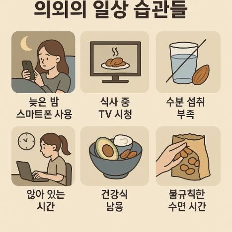 첫 번째는 **늦은 밤 스마트폰 사용**이다. 블루라이트 노출은 수면 호르몬인 멜라토닌 분비를 방해하여 수면의 질을 낮춘다. 수면 부족은 식욕 조절 호르몬(렙틴·그렐린)의 균형을 무너뜨려 폭식이나 단 음식에 대한 갈망을 유발할 수 있다. 두 번째는 **식사 중 TV 시청 또는 스마트폰 사용**이다. 시각적 자극에 몰두하면 뇌는 포만감을 인지하기 어려워 과식으로 이어진다. 세 번째는 **수분 섭취 부족**이다. 물을 충분히 마시지 않으면 대사 효율이 떨어지고, 갈증을 배고픔으로 오인해 불필요한 간식을 먹게 될 수 있다. 네 번째는 **앉아 있는 시간이 지나치게 긴 생활 방식**이다. 사무직, 재택근무, 공부 등으로 인해 하루 대부분을 앉아서 보내는 경우, 아무리 운동을 하더라도 활동 대사량이 낮아져 감량이 어렵다. 30분마다 한 번씩 일어나 가볍게 스트레칭하는 것만으로도 대사 속도는 향상될 수 있다. 다섯 번째는 **단순한 '건강식' 오용**이다. 아몬드, 아보카도, 그릭요거트 등 건강에 좋다는 식품도 과잉 섭취하면 고열량이 된다. 식품 자체가 아닌 섭취량과 빈도가 핵심이다. 여섯 번째는 **무의식적 간식 섭취**다. 업무 중 입이 심심하다는 이유로 커피와 함께 과자, 젤리 등을 습관적으로 먹는 경우가 많다. 하루 칼로리 섭취에서 가장 통제되지 않는 영역이기도 하며, 인식되지 않는 섭취가 누적되면 체중 증가로 이어진다. 일곱 번째는 **불규칙한 수면 시간**이다. 수면 리듬이 일정하지 않으면 호르몬 분비 주기가 흐트러지고, 이는 전반적인 식욕과 대사 기능에 부정적 영향을 준다. 이처럼 우리의 일상은 수많은 ‘습관’으로 구성되어 있고, 그 습관들이 다이어트의 성공과 실패를 좌우한다. 따라서 감량이 정체되었거나 기대에 못 미친다면, 이런 생활 습관들을 먼저 점검해보는 것이 필요하다.